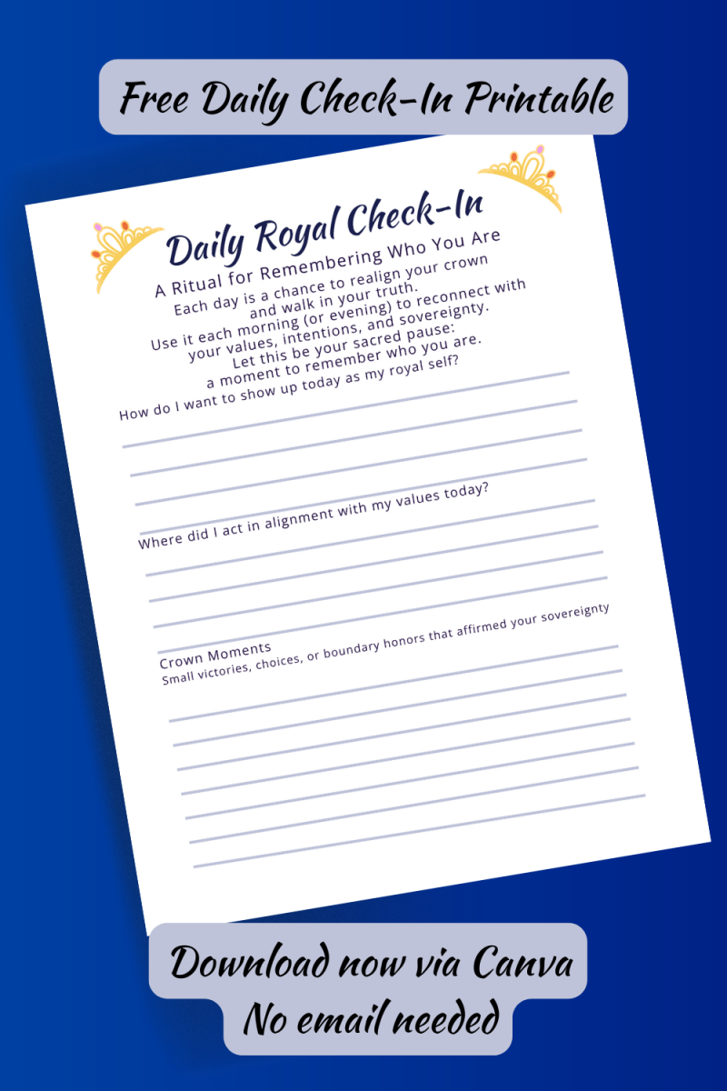 Use the Daily Royal Check-In sheet to reconnect with your inner sovereign each morning or night. A few minutes of journaling or mindful review can shift your energy and reinforce your place on the throne.